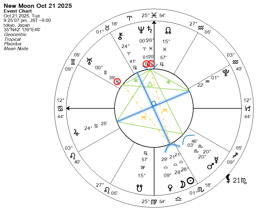 2025年10月21日午後9時25分、天秤座29度(数え)での新月です。(東京で作成)