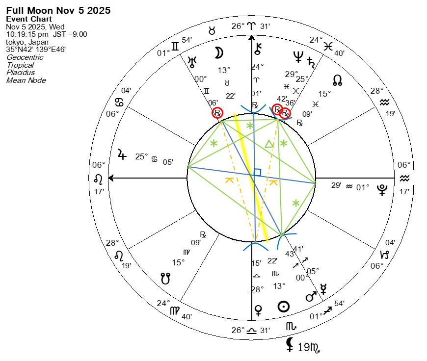 ・11月8日、双子座の月-土星・海王星(柔軟宮のスクエア)