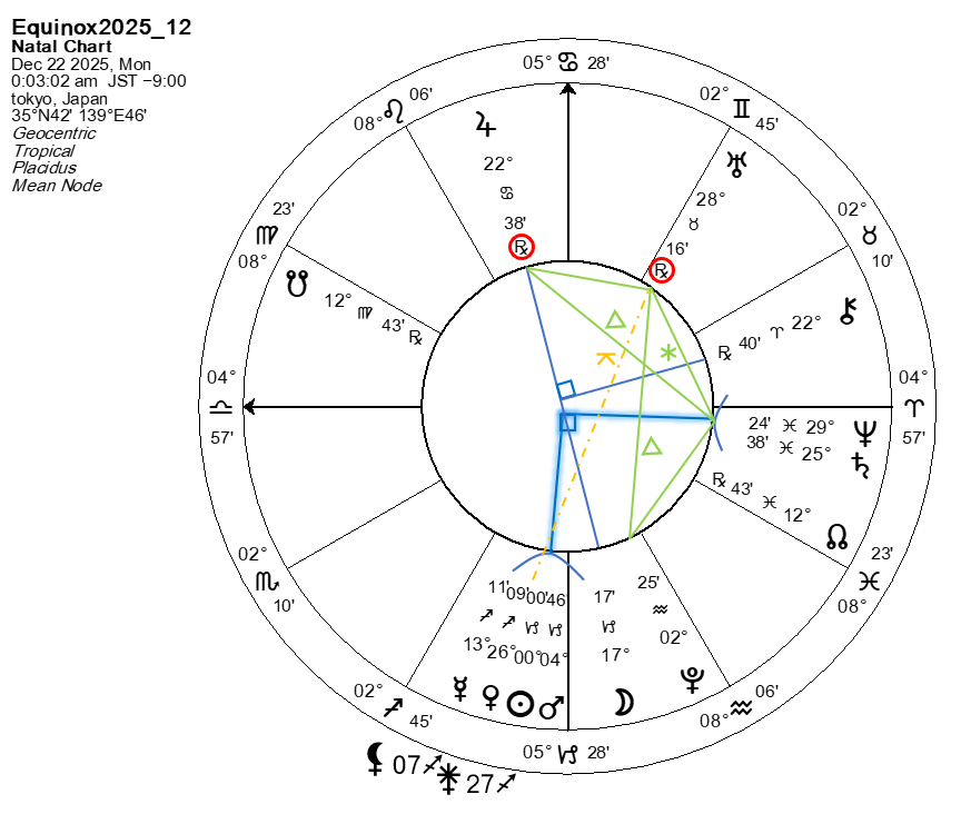 冬至図の山羊座0度の太陽に対して、「金星・火星・ジュノーの合」と「土星・海王星のスクエア」が刻み込まれています。