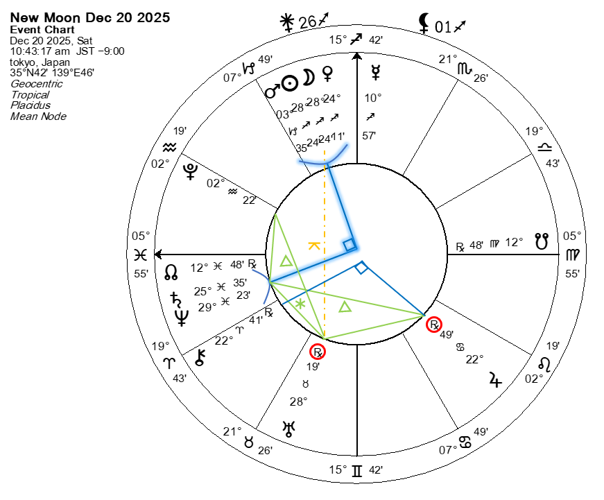 2025年12月20日午前10時43分、射手座29度(数え)での新月です。(東京で作成)