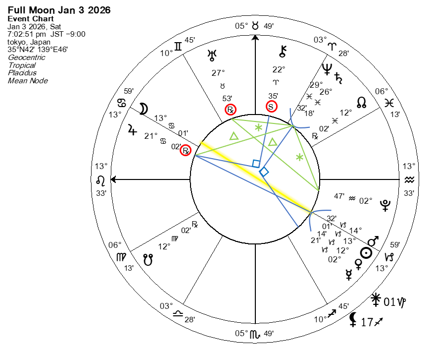 ・1月2日、双子座の月-水星-土星・海王星(Tスクエア)