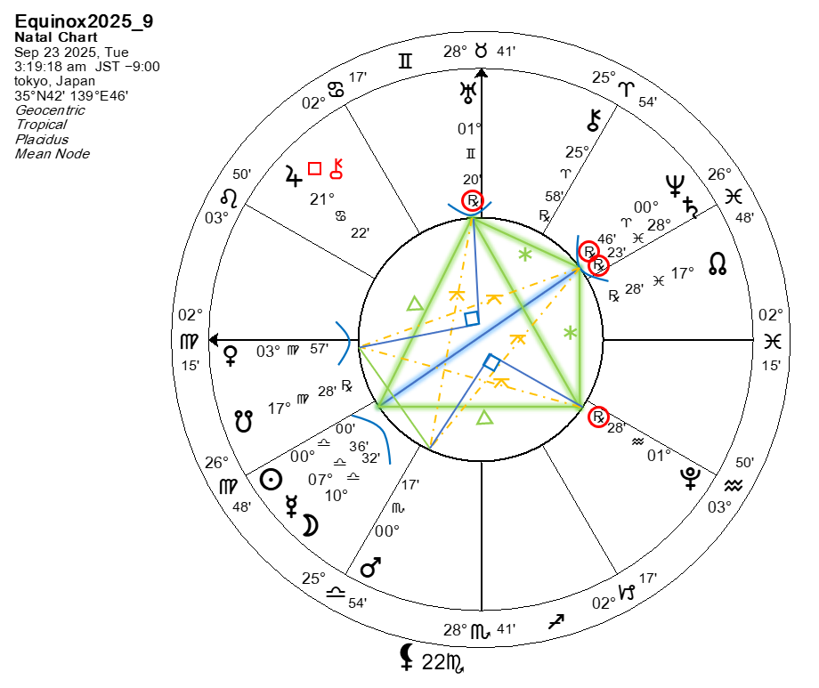 ・9月22日、乙女座の月・太陽-天王星-土星・海王星-冥王星(カイト)