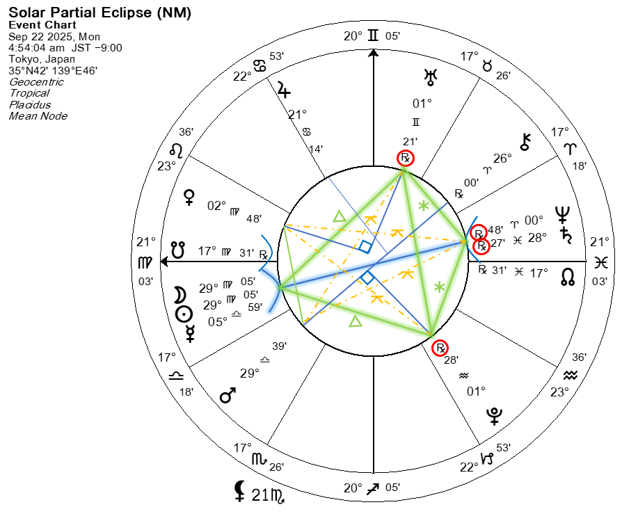 - 日食は水星と合、土星・海王星、天王星、冥王星とカイトを形成