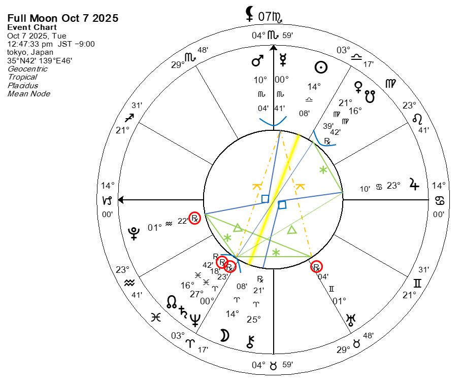 満月に対するメジャーアスペクトは無しですが、天王星が45度/135度を形成しています。